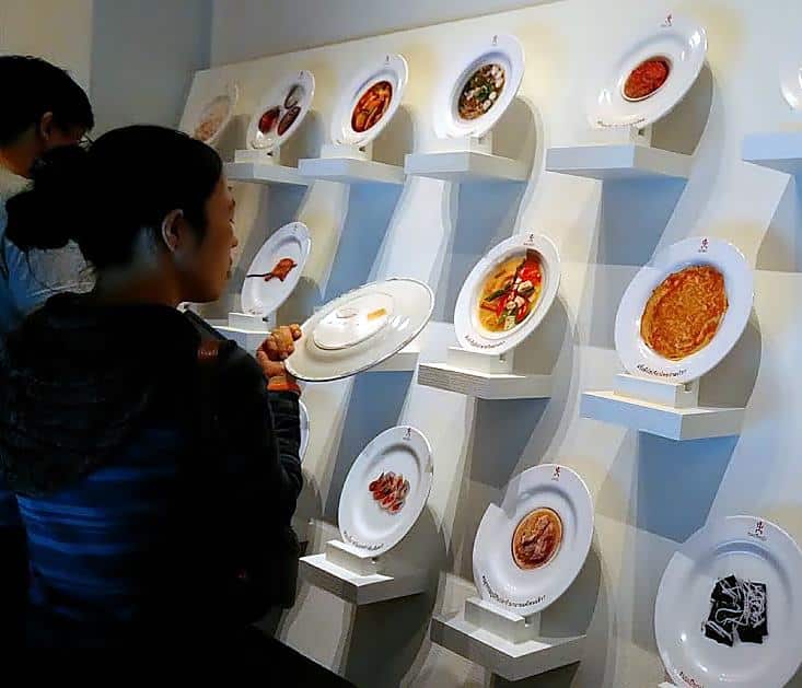 นอกเหนือจากเกร็ดความรู้บนก้นจานแล้ว ถ้าอยากรู้ว่าเมนูอาหารที่มีชื่อเสียงเช่น ส้มตำ หรือ ผัดไทย มีส่วนผสม และขั้นตอนในการปรุงอย่างไรบ้าง ให้เลือกจานใบใหญ่ ที่ไร้ภาพอาหารบนจาน นำมาวางบนจุดสำหรับสแกน QR Code วางให้ตรงตำแหน่งนะคะ เราก็จะได้ลุ้นกันค่ะว่า จานที่เราสุ่มเลือกมา คือ เมนูอะไร และมีส่วนผสมอะไร ขั้นตอนในการปรุงทำอย่างไรบ้าง ใครสนใจ จดกันได้เลยนะคะ หรือจะเก็บภาพแล้วลองไปปรุงทานดู บางทีเราอาจจะได้เมนูอาหารประจำบ้านเพิ่มมาอีก ๑ รายการอร่อยๆ ค่ะ เป็นความสนุกสนานที่ต้องลุ้น และจินตนาการความเป็นไทย ผ่านรสชาติ และส่วนผสมอันหลากหลายทั้งเครื่องเทศแบบไทยๆ และผักท้องถิ่นที่หาได้ในบ้านของเรา ผ่านจานเด็ดกลายเป็นเมนูอาหารไทยที่ขึ้นชื่อและรู้จักกันไปทั่วโลก