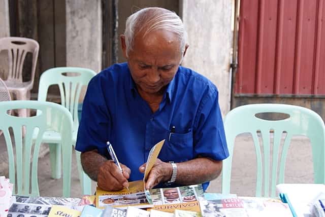 <<< ย้อนกลับไป เมื่อครั้งที่เขาถูกกวาดต้อนและถูกส่งมายัง คุก S-21 เขาเล่าว่าตัวเขาเอง และเพื่อนผู้ประสบเคราะห์กรรมเหมือนเขา จะถูกมัดมือไพล่หลัง ถูกปิดตา และมีโซ่ตรวนที่คล้องข้อเท้าเอาไว้ ความทุกข์ทรมานที่ได้รับนอกเหนือจากการถูกทุบตี ช็อตไฟฟ้า และทรมานด้วยวิธีต่างๆ แล้ว ยังต้องทรมานจากความหิวโหยจนแม้กระทั่งต้องจับแมลงเม่า แมลงสาบ จิ้งจกที่อยู่ในคุกกินประทังชีวิต